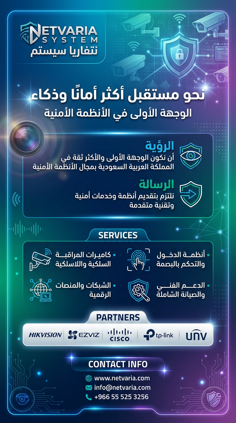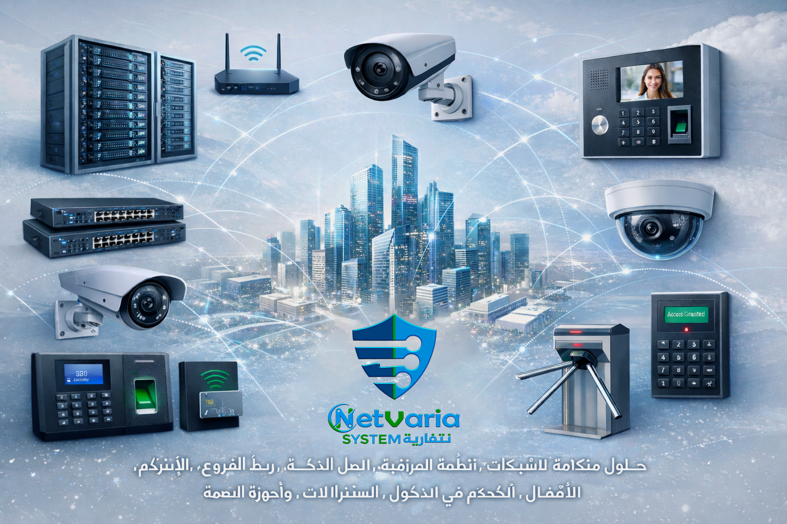 نتفارية سيستم توفر حلول متكاملة في الشبكات، الكاميرات وأنظمة المراقبة، ربط الفروع، الإنتركم، الأقفال الذكية، التحكم في الدخول (Access Control)، السنترالات، أنظمة الحماية، وأجهزة البصمة، لتجعل رحلتك نحو بيئة أكثر أمانًا وذكاء سهلة ومضمونة